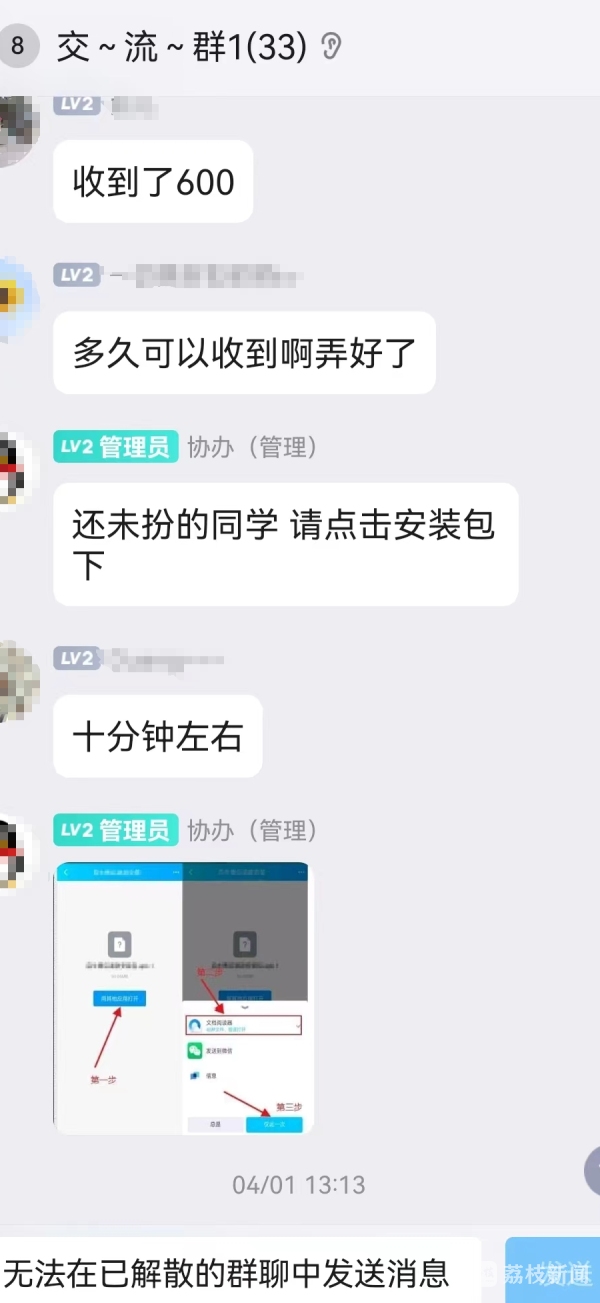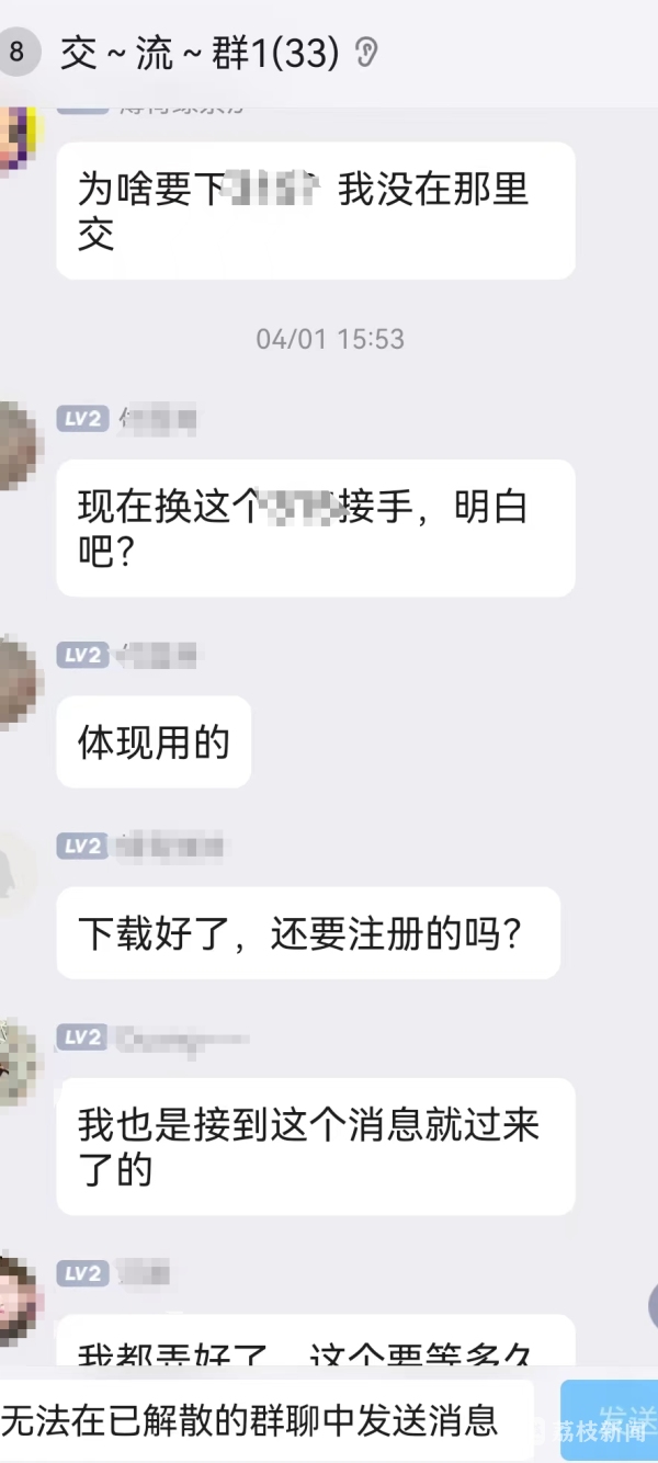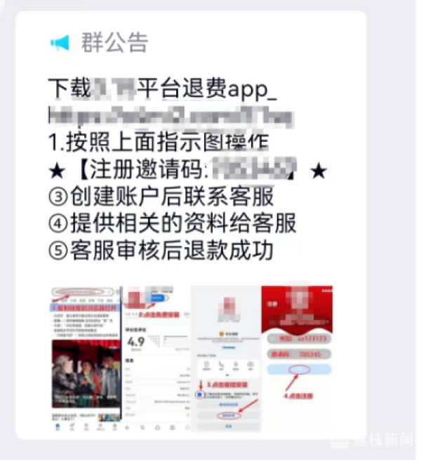 林先生前两天收到了一个快递,快递有一个“公告”称,根据“双减”政策,将全额退还已缴纳的学费。林先生没有怀疑,按照“公告”上的流程与“客服”取得联系。很快,林先生被拉入一个33人的交流群,群内“管理员”提示,为了完成退费流程,须先下载一款APP,注册成功后联系“客服”,提交材料,通过审核后便可退费。