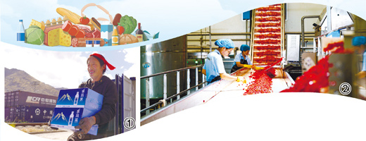 图①:拉萨西货场,工人正在装卸即将通过铁路外运的矿泉水。 本报记者 徐驭尧摄 图②:新疆昌吉一家企业,生产线正在加工番茄产品。 常谊谊摄